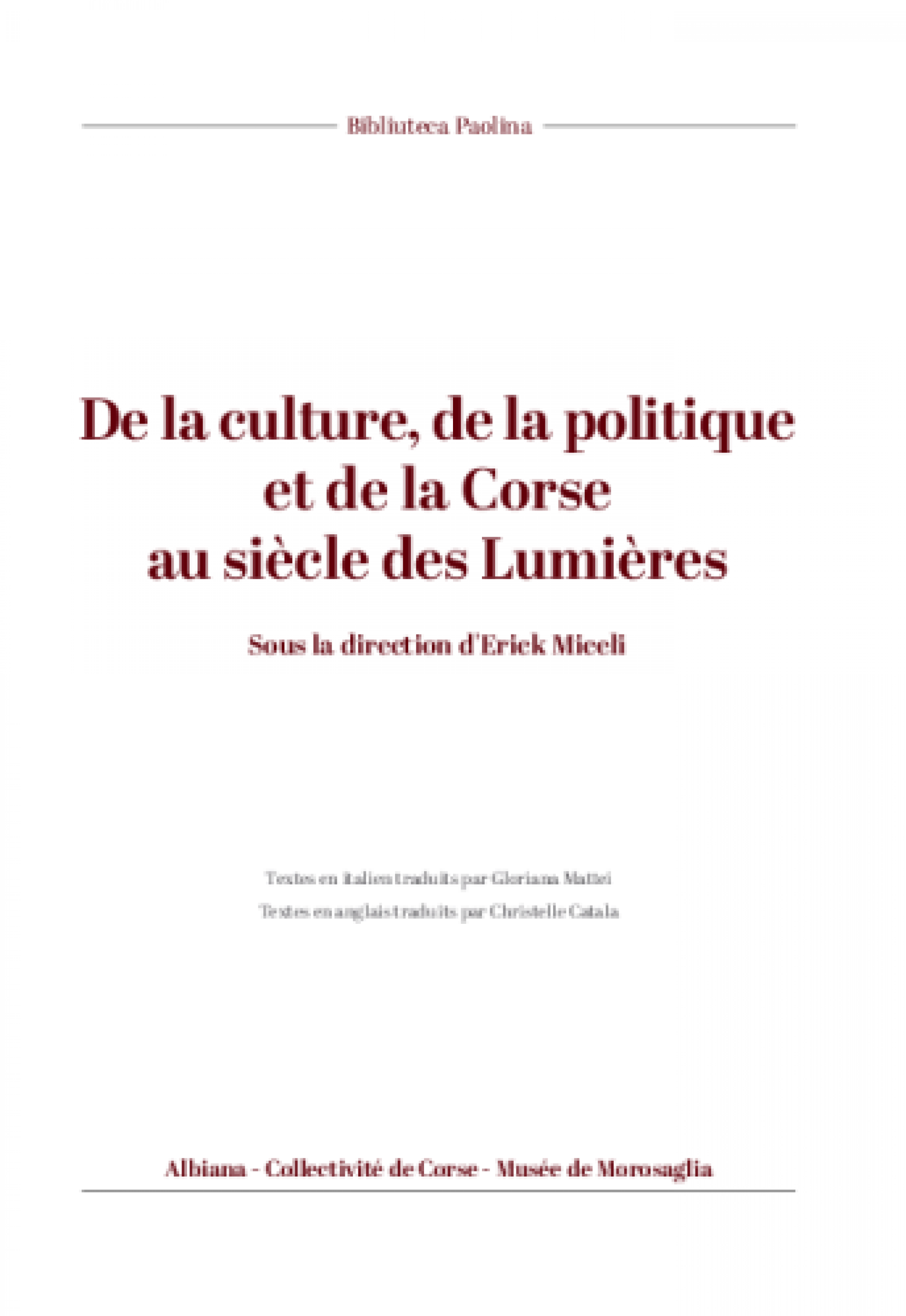 A creazione di a Bibliuteca Paolina, una nova cullezzione di libri trattendu di u XVIIIu seculu cun u libru cullettivu « De la culture, de la politique et de la Corse au siècle des Lumières » à l’edizione Albiana, cullezzione diretta a Erick Micelli è Isabelle Latour.