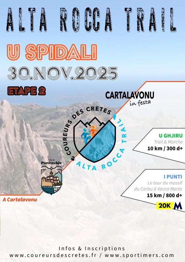 A seconda edizione di u trail di l’Alta Rocca, dettu Spidali Trail, si corre dumenica nant’à dui parcorsi di 15 è 10 chilometri, chjamati rispettivamente I Punti è U Ghjiru. A prima partenza hè prevista à 10 ore. Regis Rico è François Gelmini avianu vintu a prima edizione.